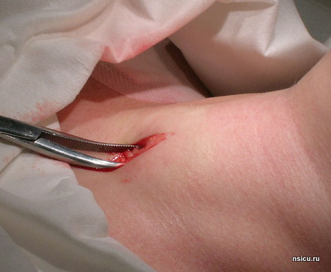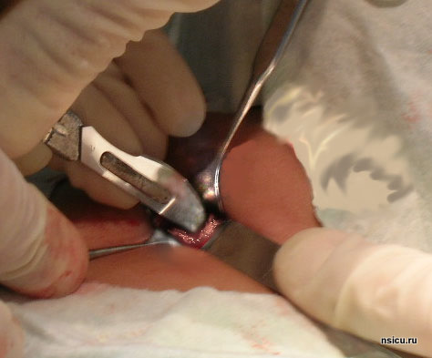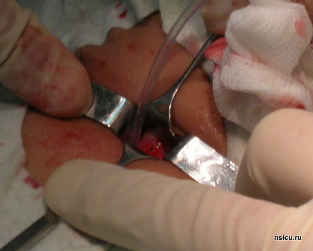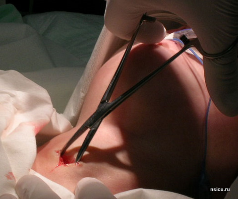 Перед началом хирургической трахеостомии после придания пациенту положения с валиком под плечами интубационную трубку мы продвигаем максимально глубоко, в положение «нижний срез трубки над кариной трахеи». Это позволяет избежать повреждения герметизирующей манжетки и разгерметизации системы «дыхательный контур – интубационная трубка – трахея пациента» после вскрытия трахеи. Такое положение интубационной трубки позволяет используя тонкий санационный катетер эвакуировать из трахеи, в зоне операции, кровь и мокроту через уже сформированную стому перед извлечением интубационной трубки. Операцию трахеостомии следует рассматривать не как учебную операцию для тренировки молодых ординаторов, а как хирургическое вмешательство на жизненно важных органах. В составе бригады выполняющей эту операцию должен быть специалист в совершенстве владеющий техникой трахеостомии и несущий всю полноту ответственности за исход операции.