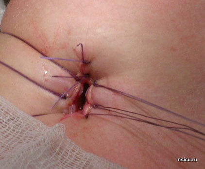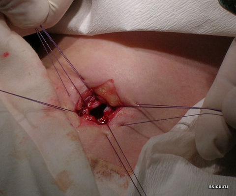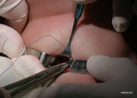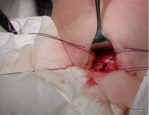 В нашем отделении при выполнении хирургической трахеостомии во всех случаях осуществляется вертикальный разрез кожи и обязательное формирование стомы с использованием кожно-трахеальных швов.