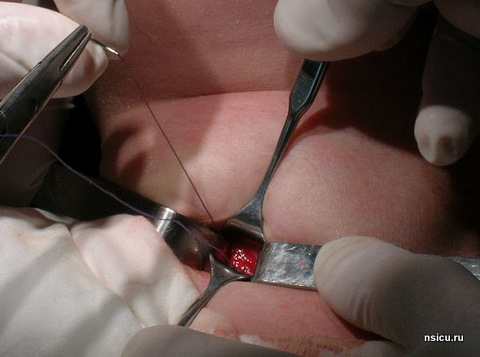 Оперировать целесообразно в условиях общей анестезии, с добавлением местного обезболивания для гидравлической препаровки тканей. Под плечи больного подкладывают поперечный валик высотой 10 -12см. Не следует чрезмерно запрокидывать голову – это приводит к смещению трахеи в краниальном направлении и изменению анатомических ориентиров. Разрез кожи длиной 4-5см лучше делать вертикально от середины перстневидного хряща вниз (при короткой шее можно произвести горизонтальный разрез длиной 6-7см на 1,5-2см ниже перстневидного хряща). Затем тупым путем раздвигают мягкие ткани до трахеи по «белой линии» шеи. При этом необходимо постоянно контролировать пальцем положение трахеи, чтобы не сместиться в сторону от нее. Перешеек щитовидной железы тупо смещают вниз или вверх в зависимости от анатомических особенностей. Некоторые авторы рекомендуют пересекать перешеек, чтобы в нем не возникало пролежней от давления канюли. Нельзя чрезмерно скелетизировать кольца трахеи, чтобы не нарушить кровоснабжение ее хрящей (опасность развития рубцовых осложнений). По средней линии рассекают два хрящевых полукольца, оптимально 2-3е или 3-4е. Повреждения 1-го полукольца, а тем более перстневидного или щитовидного хрящей гортани значительно повышают вероятность образования стеноза после деканюляции. При выполнении трахеостомии у больных, которым предполагается длительное стояние канюли в трахее (более 1 мес.), рекомендуется подшивать края разреза слизистой оболочки трахеи к краям кожной раны. При этом особое внимание следует обращать на изоляцию хрящей трахеи от просвета последней, это значительно снижает возможность их инфицирования. Опасения, связанные с возможным формированием хронической трахеостомии, которая в дальнейшем может потребовать хирургического устранения, необоснованны. Практически всегда трахеальный дефект закрывается самостоятельно (Паршин В.Д., 2000). Канюлю закрепляют, обведя вокруг шеи больного две марлевые или матерчатые завязки, продетые в отверстия щитка трахеостомической трубки, которые связывают между собой на боковой (не на задней!) поверхности шеи легко развязываемым узлом».