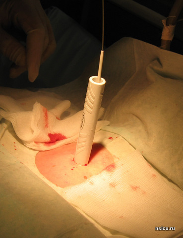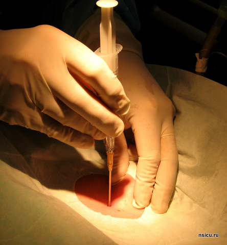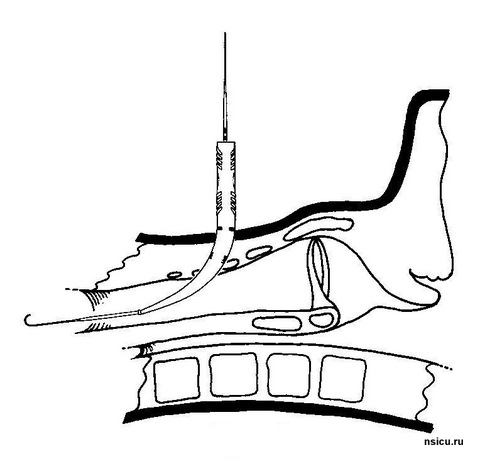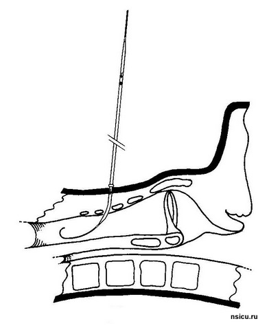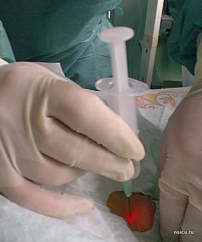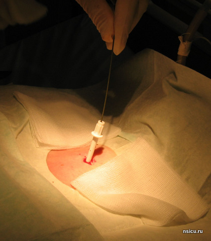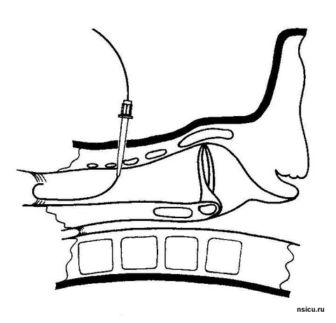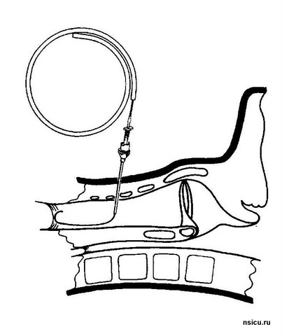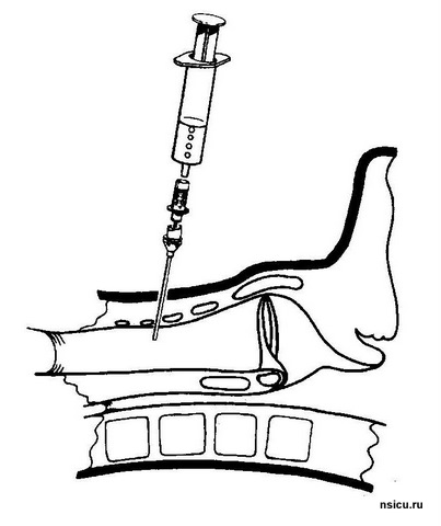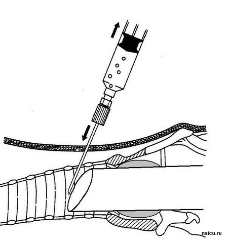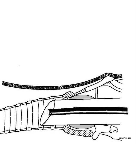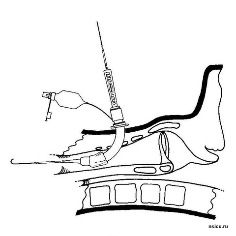 Далее проводится пробная (поисковая) пункция трахеи тонкой иглой выше ярёмной вырезки на 1-1,5 см в проекцию светового пятна бронхоскопа. Фибробронхоскопический контроль позволяет полностью исключить травмирование задней стенки трахеи.