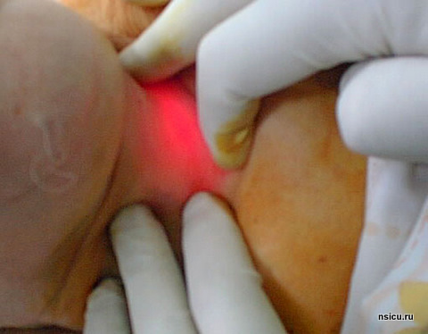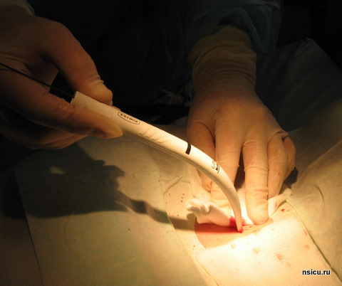При этом режимы ИВЛ корректируют с учётом повышения сопротивления вдоху. Вначале интубационная трубка подтягивается вверх до положения, когда герметизирующая манжета находится над голосовыми складками. Контроль положения трубки осуществляется путём визуализации светового пятна бронхоскопа на передней поверхности шеи пациента.