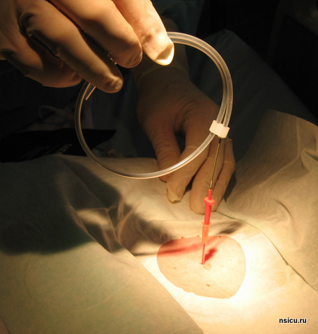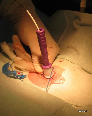 Затем производится пункция трахеи уже толстой иглой с пластиковой канюлей 14 G. Канюля устанавливается в просвет трахеи, а игла удаляется. Через канюлю проводится металлический, гибкий проводник по методу Сельдингера. Канюля удаляется. Скальпелем производится кожный разрез в месте предполагаемой стомы, величина разреза должна соответствовать диаметру устанавливаемой трубки.