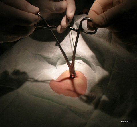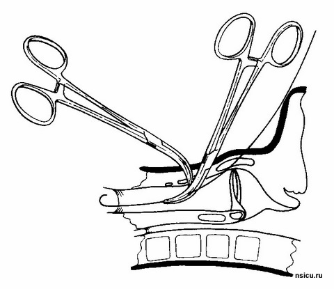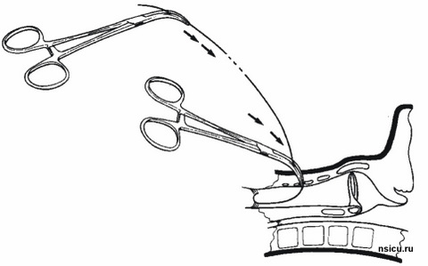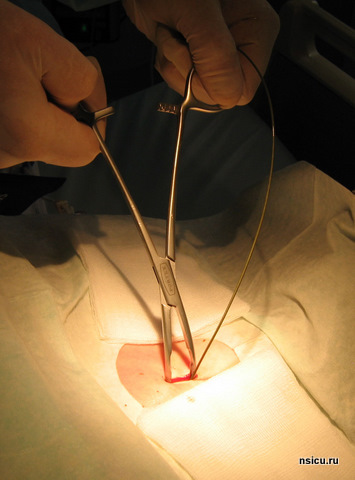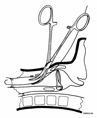 Далее растягивают претрахеальные ткани, открывая зажим и удаляя его в открытой позиции. Повторно нанизывают зажим на проводник и продвигают их до передней стенки трахеи. Затем, переводят рукоятки зажима в вертикальное положение так, чтобы конец зажима, продвигаясь вперед, пенетрировал трахеальную стенку и расположился в трахеи продольно.
