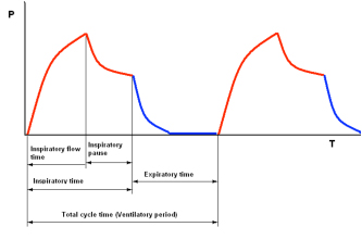 Для аппарата ИВЛ время вдоха (inspiratory time) – это временной интервал от момента открытия клапана вдоха до открытия клапана выдоха. Эксперты делят вдох на две части. Inspiratory time =Inspiratory flow time + Inspiratory pause.