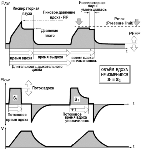 Напомним, способ управления вдохом Volume control обеспечивает доставку предписанного дыхательного объёма. Для аппарата ИВЛ дыхательный объём – это цель (target). Давление в дыхательных путях зависит от сопротивления потоку (resistance) и податливости (compliance), а объём – это произведение потока на время. Аппарату ИВЛ поставлена задача: доставить дыхательный объём, не превышая Pressure limit. Единственное решение - уменьшить поток и увеличить потоковое время вдоха. В результате, сокращается инспираторная пауза, но время вдоха не меняется. Дыхательный объём не меняется, на схеме это площадь под кривой потока, S1=S2.