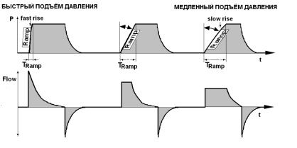 Соответственно, чем меньше поток, тем большее усилие прикладывает пациент, чтобы вдохнуть тот же объём. Быстрое достижение предписанного уровня давления поддержки называется fast rise, а медленное – slow rise.