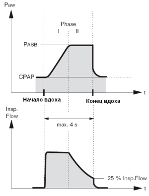 Приводимая ниже схема из инструкции к аппаратам ИВЛ серии EVITA показывает условное деление вдоха на две фазы. В первой фазе достигается давление поддержки, а во второй поддержка длится до снижения потока до 25%. Длительность первой фазы - Tramp