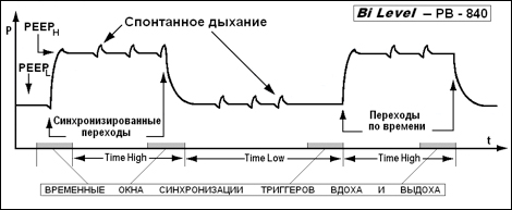 Для того, чтобы предотвратить конфликт пациента с аппаратом ИВЛ, режим «BiLevel», как и «BIPAP», был дополнен возможностью синхронизации переключения между уровнями давления с дыхательной активностью пациента. Режим «BiLevel», как и «BIPAP» имеет два триггера. Один триггер синхронизирует переключение с нижнего уровня на верхний, а второй - с верхнего на нижний. Для работы каждого триггера выделено своё временное окно.
