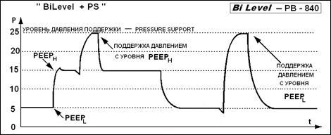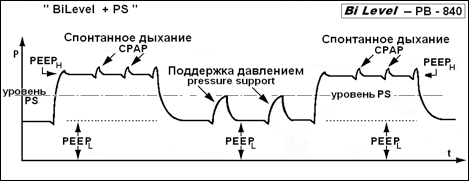 Этот режим очень похож на «BIPAP» от фирмы Dräger. Главное отличие в том, что в режиме «BIPAP» опция «PSV» работает только с уровня PEEP low , а в «BiLevel» поддержка спонтанного дыхания возможна с двух уровней (PEEP low и PEEP high).