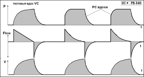 Как и в режиме «VS», когда активность пациента растет и инспираторное усилие увеличивается, аппарат уменьшает поддержку и позволяет пациенту «потренировать дыхательную мускулатуру». Когда пациент утомляется, и инспираторное усилие снижается, аппарат увеличивает поддержку. Если растет сопротивление дыхательных путей или снижается комплайнс, аппарат увеличивает поддержку. * Особенностью режима «VC+» на аппарате PB-840 является то, что тестовый вдох, управляемый по объёму, выполняется с использованием убывающего потока (на графике потока прямоугольный треугольник гипотенузой налево; основание треугольника – время вдоха, а площадь – дыхательный объём). Выполнив тестовый вдох, аппарат узнает, какой уровень давления вдоха (inspiratory pressure) нужно использовать, чтобы доставить целевой дыхательный объём.