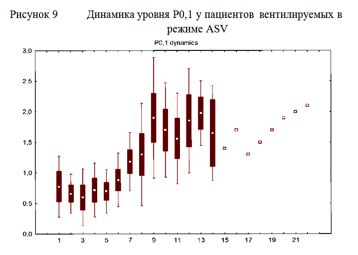У всех пациентов исходно уровень показателя P0,1, отражающего активность дыхательного центра, был значительно ниже нормальных значений и составлял 0,78±0,5. По мере нарастания спонтанной дыхательной активности отмечалось нарастание показателя P0,1, который со временем достигал нормальных значений. К моменту прекращения ИВЛ средний уровень P0,1 составлял 2,5±0,3 (рисунок 9).