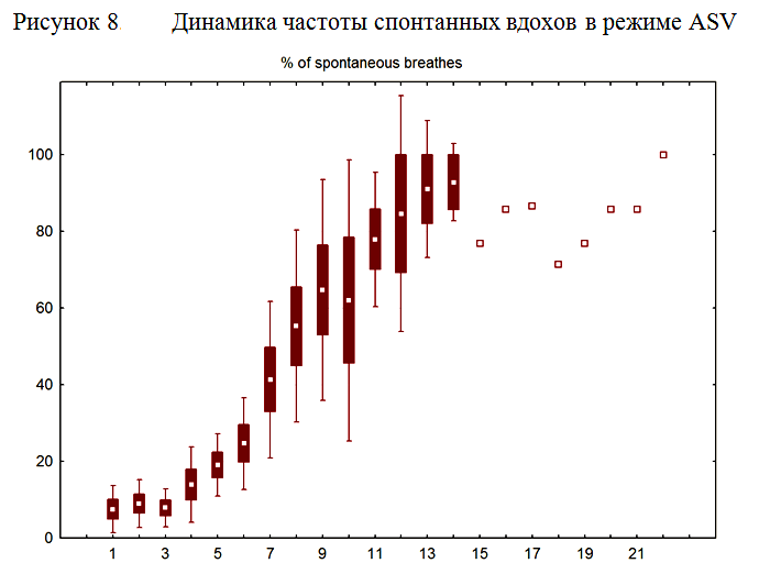 Режим ASV использовался в качестве стартового у 33 пациентов. Исходный процент замещения минутного объема составлял 100% и в дальнейшем корригировался под контролем PaCO2. В большинстве случаев режим ASV хорошо переносился пациентами, и вентиляция в этом режиме осуществлялась в течение всего периода респираторной поддержки вплоть до отключения от респиратора. В ряде случаев, ввиду развития выраженной гипервентиляции при осуществлении ИВЛ в режиме ASV, приходилось переходить на другие режимы.