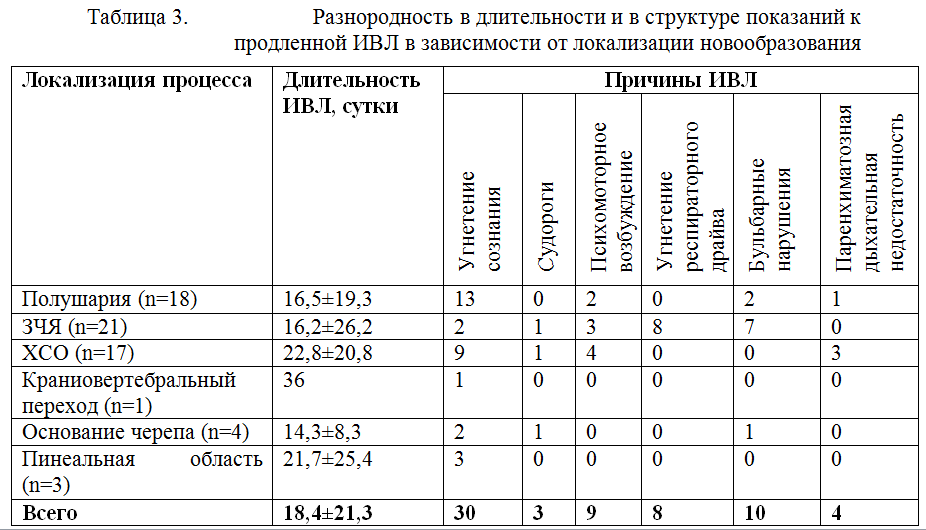 Средняя длительность ИВЛ у пациентов с нейроонкологией составила 18,4±21,3 суток. При этом отмечалась разнородность в длительности и в структуре показаний к продленной ИВЛ в зависимости от локализации новообразования.