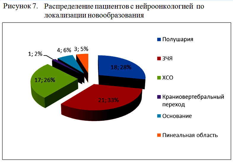 По локализации новообразования пациенты с нейроонкологией, потребовавшие проведения длительной ИВЛ, были распределены на 6 групп, как представлено на рисунке 7.