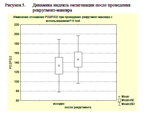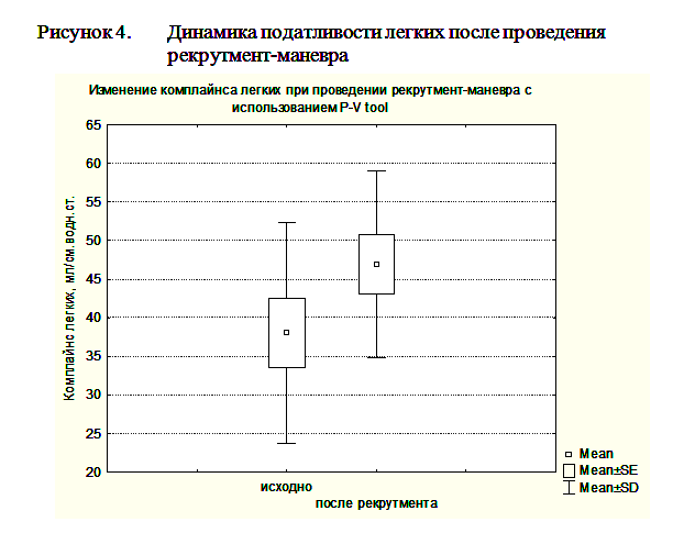 Гистерезис более 300мл мы расценивали, как предиктор эффективности рекрутмент-маневра. Рекрутмент-маневр в этих случаях выполнялся с помощью повторного маневра PVtool. При этом мы увеличивали PEEPend до значения на 2 мбар выше нижней точки перегиба, Tpause до 10сек, а остальные параметры оставляли без изменений. При гистерезисе менее 300мл рекрутмент-маневр не проводился. После выполнения маневра PVtool и, при необходимости, рекрутмент-маневра ИВЛ продолжали в режиме DuoPAP, устанавливая уровень PEEPlow на 2мбар выше нижней точки перегиба, а PEEPhigh на уровне на 2 мбар ниже верхней точки перегиба. Всего рекрутмент маневр был выполнен у 8 пациентов с ЧМТ. Проведение рекрутмент-маневра приводило к возрастанию индексу оксигенации (PO2/FiO2) с 128,9±47,4 по 148,2±55,5 и повышению комплайнса легких с 38,1±14,3 мл/мбар до 49,9±12,1 мл/мбар при ОРДС и ОПЛ (рисунки 4, 5).