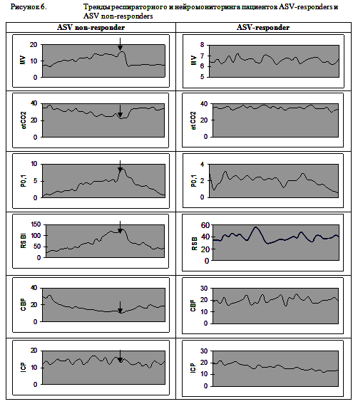 У 10 пациентов с ЧМТ мы с первых суток ИВЛ использовали режим ASV. Предположительными преимуществами режима ASV у пациентов с ЧМТ перед принудительными режимами вентиляции являются обеспечение заданного оператором минутного объема вентиляции вне зависимости от самостоятельной дыхательной активности пациента и подбор параметров вентиляции (частоты дыхания, инспираторного давления) оптимальных для защиты легких конкретного пациента, с учетом индивидуальных особенностей респираторной механики пациента. Из 10 пациентов с ЧМТ, у которых с первых суток использовался режим ASV, в 7 случаях этот режим хорошо переносился пациентами и использовался до момента отключения от респиратора. При этом отмечалось постепенное нарастание доли спонтанных вдохов и снижение подбираемого респиратором инспираторного давления. У 3 пациентов при использовании режима ASV развивалась гипервентиляция, сопровождающаяся выраженным снижением уровня PCO2 и снижением регионарного мозгового кровотока, а также нарастание уровня Р0,1. В связи с плохой переносимостью режима ASV у этих пациентов выполнялась смена режима вентиляции на SIMV. Вероятно, развитие гипервентиляции у этой группы пациентов было обусловлено ирритацией стволовых структур за счет дислокации головного мозга. Перевод в принудительные режимы вентиляции позволял добиться нормовентиляции, нормализации EtCO2 и регионарного церебрального кровотока и снижения P0,1. Примеры трендов респираторного и нейромониторинга пациентов, хорошо переносивших режим ASV (ASV-responders), и потребовавших перевода в режим SIMV (ASV non-responders) представлены на рисунке 6.