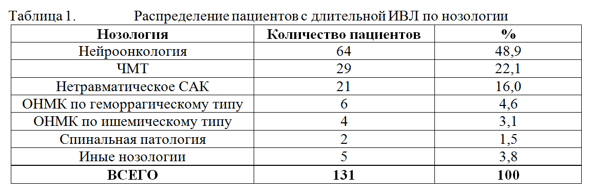 Исследование носило ретроспективный характер и было основано на анализе историй болезни пациентов, находившихся на лечении в отделении реанимации с января 2010 по декабрь 2010 г включительно. Критерием включения являлась продолжительность ИВЛ свыше 48 часов. Анализировалась длительность ИВЛ, показания к пролонгированию ИВЛ у разных категорий больных, сроки экстубации, сроки трахеостомии, частота развития вентилятор-ассоциированной пневмонии. Согласно критериям включения, для анализа была отобрана 131 история болезни. Среди включенных в исследование пациентов было 77 мужчин и 54 женщины в возрасте от 2 месяцев до 81 года (средний возраст составил 34,5±19,6 лет). Среди пациентов, потребовавших проведения пролонгированной ИВЛ, было 64 пациента с нейроонкологией, 29 пациентов с ЧМТ, 21 пациент с САК, 6 пациентов с геморрагическим инсультом, 4 пациента с ишемическим инсультом, 2 пациента со спинальной патологией и 5 пациентов с иными нозологиями. В таблице 1 представлено разделение пациентов, нуждавшихся в пролонгированной ИВЛ, по нозологии.