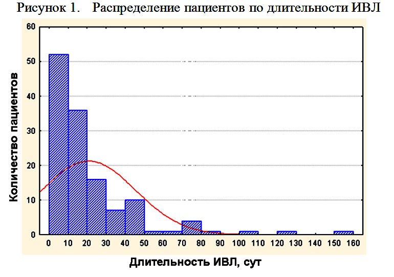 Средняя длительность ИВЛ составила 20,8±24,5 суток. На рисунке 1 и в таблице 2 представлено распределение пациентов по длительности ИВЛ.
