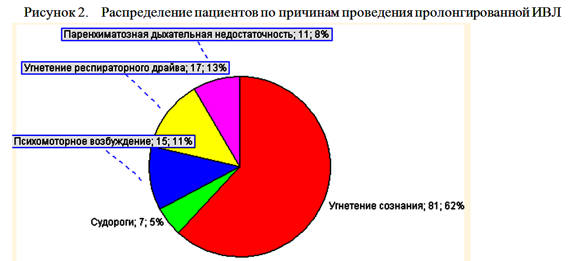 Причинами проведения пролонгированной ИВЛ служило угнетение сознания в 81 (61,8%) случаев, необходимость седации в 21 (16,8%) случаев (из них в 7 (5,3%) случаях в связи с судорогами, в 15(11,5%) случаях в связи с психо-моторным возбуждением), угнетение респираторного драйва в 17 (13%) случаев, паренхиматозная дыхательная недостаточность в 11 (8,4%) случаев (рисунок 2).