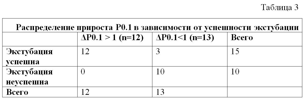 4: Прирост Р0,1 (ΔР0.1) во время SBT как предиктор успешности прекращения ИВЛ у пациентов с поврежденным стволом мозга. Для оценки прогностической значимости величины прироста Р0.1 (ΔР0.1) в ходе теста спонтанного дыхания пациенты были разделены в зависимости от величины ΔР0.1. Исходя из предварительной оценки результатов исследования величиной прироста Р0.1 для разделения выбрали ΔР0.1= 1мбар. В результате у 12 человек была ΔР0.1>1, а у 13 человек прирост Р0.1 во время SBT, меньше 1мбар (ΔР0.1<1). Все 12 пациентов с хорошим нарастанием Р0.1 во время SBT (ΔP0.1>1) были успешно экстубированы. Из 13 пациентов с ΔР0.1<1 только 3 были успешно экстубированы, а остальные 10 потребовали продленной ИВЛ (Таблица №3).