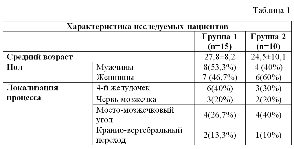 В исследование было включено 25 пациентов после удаления опухолей ЗЧЯ. Пациенты были разделены на две группы в зависимости от успешности экстубации. В группу 1 вошли 15 пациентов, которые были успешно экстубированы в первые 24 часа после операции. В группу 2 вошли 10 пациентов, которым потребовалось проведение пролонгированной ИВЛ в связи с недостаточной дыхательной активностью, проявляющейся эпизодами апноэ, брадипноэ или недостаточной глубиной дыхания при переводе на спонтанное дыхание. Характеристика исследуемых пациентов представлена в таблице №1.