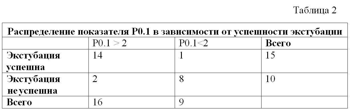 Величина Р0,1 во время SBT как самостоятельный предиктор успешности прекращения ИВЛ у пациентов с поврежденным стволом мозга. Приводим анализ взаимосвязи успешности экстубации и показателя Р0.1 после пробуждения при проведении теста спонтанного дыхания. Для оценки абсолютной величины Р0.1, как предиктора успешного прекращения ИВЛ, мы разделили всех пациентов включенных в исследование в соответствии с величиной Р0.1 полученной во время SBT. Точкой раздела взяли Р0.1=2 мбар. Из всех пациентов включенных в исследование у 16 пациентов было Р0.1>2 (нормальный), а у 9 пациентов было Р0.1<2 (низкий). Из 16 пациентов с нормальным Р0.1(>2) 14 были успешно экстубированы, а 2 протребовали проведения продленной ИВЛ. Среди пациентов с низким Р0.1 (<2) только 1 пациент был экстубирован и переведен на самостоятельное дыхание в течение первых 24 часов, а остальные 8 потребовали продленной ИВЛ (Таблица №2).