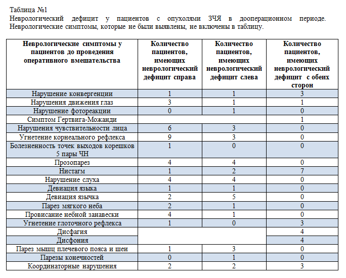 16 пациентов, вошедших в исследование до оперативного вмешательства, были в ясном сознании, 1 - в легком оглушении, 13 пациентов могли самостоятельное передвигаться и обследовались в условиях лаборатории, 4 были обследованы в палате хирургического отделения. Все 17 пациентов имели очаговый неврологический дефицит различной степени выраженности, обусловленный опухолью задней черепной ямки (таблица №1). Опухоли и их локализации были достоверно идентифицированы по результатам МРТ, интраоперационно, и по результатам биопсии. Ни у одного из пациентов опухоли не инфильтрировали ствол головного мозга, а только компримировали его в той или иной степени.